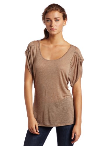 Three Dots Women's Sheer Jers Mel Short Sleeve Double Scoop Neck Top, Camel, Small Review